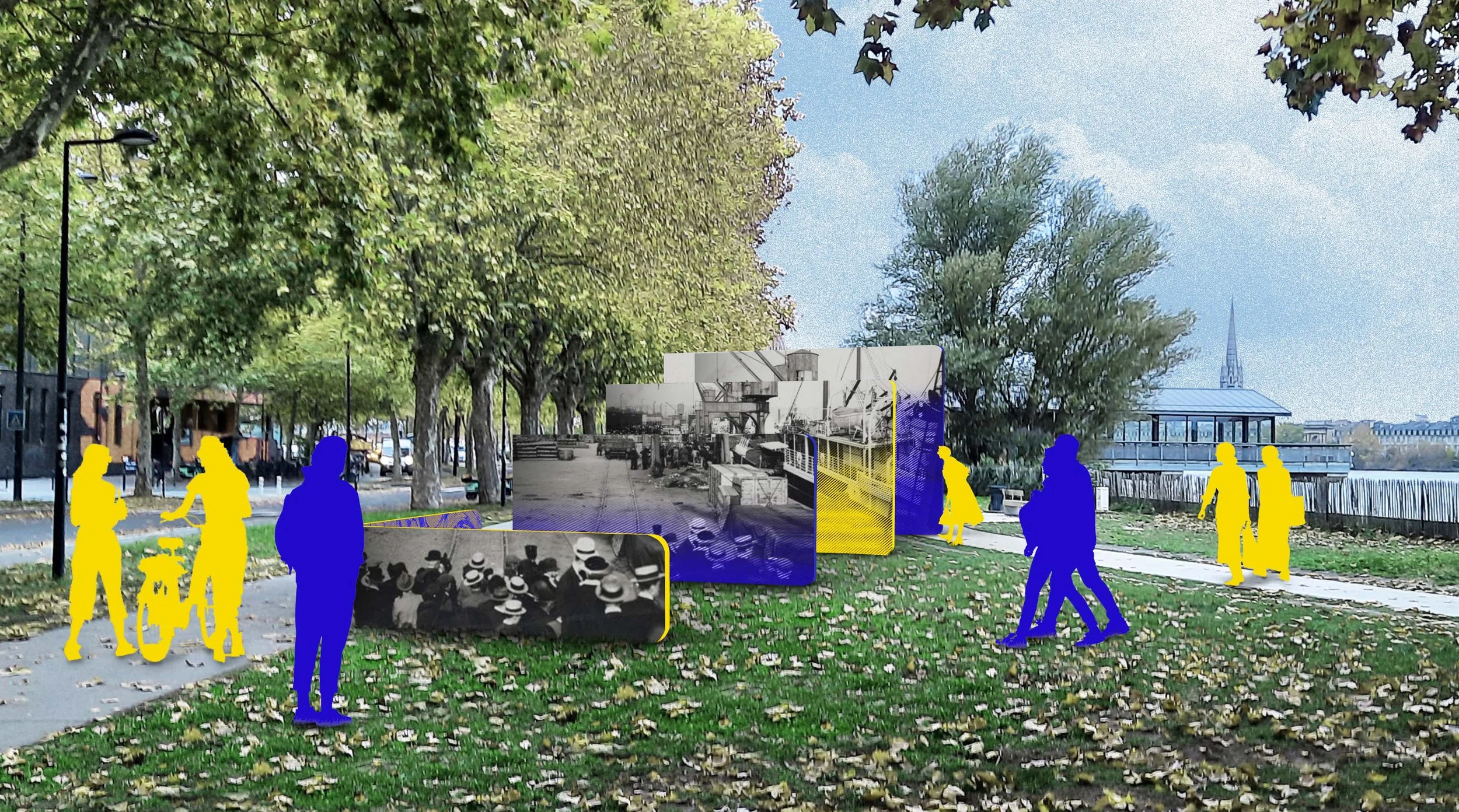 Nous voulions moderniser le format d’exposition des documents archivés en créant une symbiose entre une architecture simple et un graphisme ludique. Comme énoncé, au début nous voulions nous baser sur la notion de voir et être vu. De ce fait, nous avons usé de couleurs vives et primaires pour susciter l’intérêt des promeneurs et créer une structure attrayante pour tous. L’usage du bleu est un clin d’œil à la couleur des plans que nous avons trouvés aux archives. Nous avons décidé d’appliquer une trame bichrome en ligne aux archives que nous avons exploitées afin de les moderniser.
