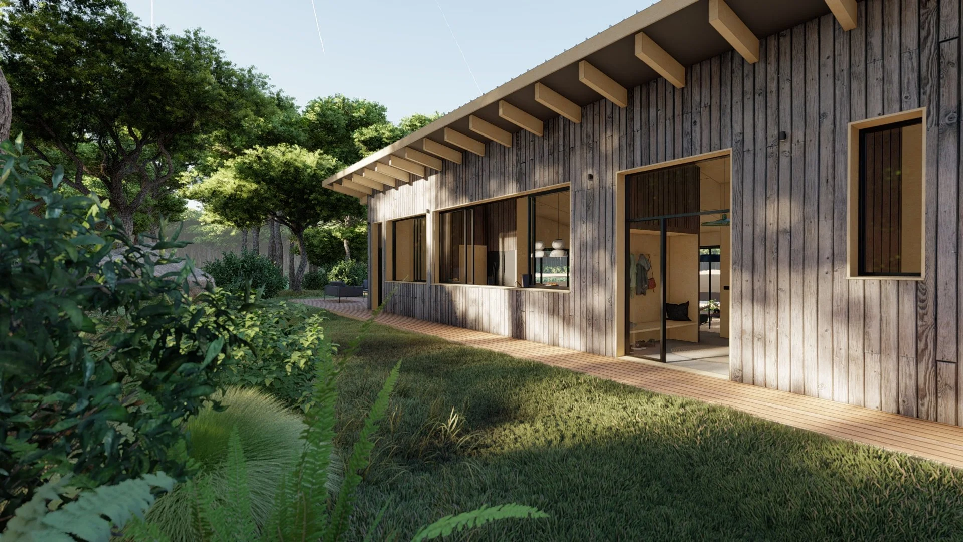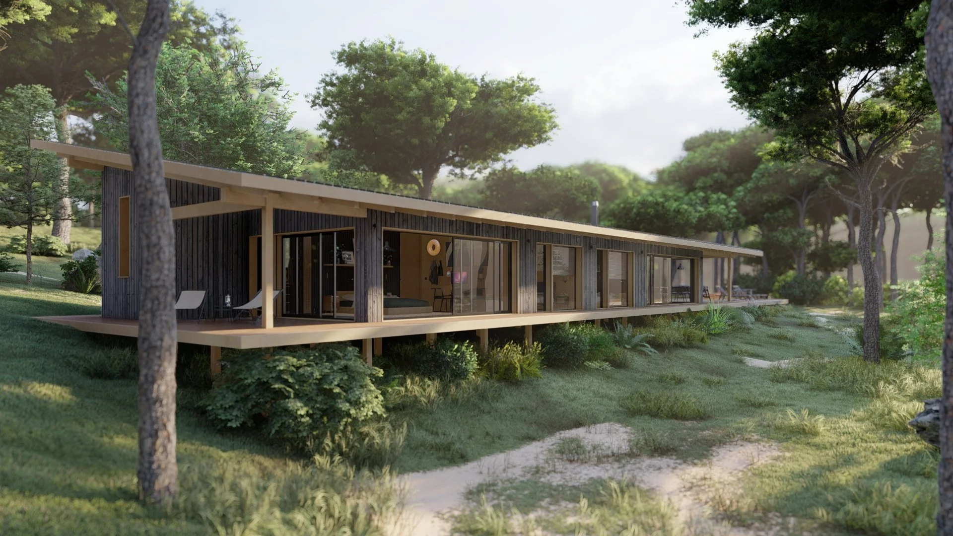 L’habitation a été pensé pour être implantée sur un terrain en pente douce planté de pins sur la rive du lac de Biscarrosse et de Parentis : le lieu possède toutes les qualités pour y couler des jours heureux. Cette maison de vacances - construite sur pilotis en ossature bois - a été pensée comme une cabane largement ouverte sur la nature environnante. Sur place, la construction a été minutieusement implantée parmi les pins et en bordure du lac. Le projet met l'accent sur l’horizontalité des volumes pour une parfaite intégration à la rive du lac. De grandes ouvertures cadrent les vues lointaines et permettent aux beaux jours d'ouvrir largement les volumes sur l’extérieur. La pente unique du toit métallique accentue la linéarité du projet et protège les espaces intérieurs du soleil grâce à de larges avant-toits. Le projet joue la carte de l’intégration paysagère et développe une approche sensible respectueuse du site.
